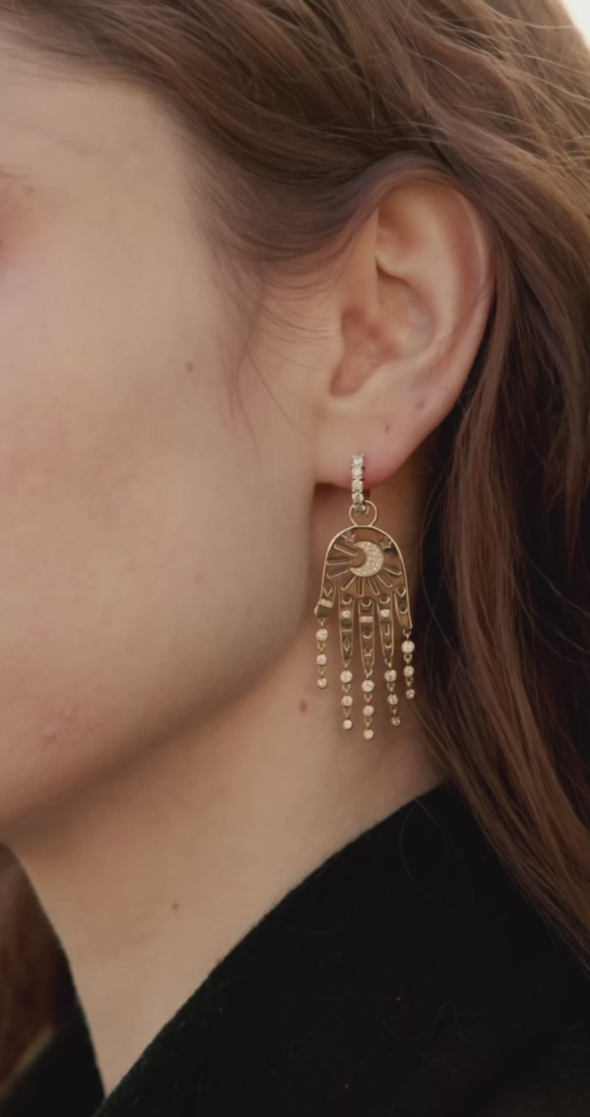 A Celeste collection favorite, the Divine Intervention Drops are a versatile EP original design featuring .85 carats of diamonds. Measuring 1.75 inches long, they can be worn as earrings with our signature huggies (sold separately) or transformed into a pendant by using our open-close bail (sold separately). Available in 14K white, yellow, or rose gold, each limited edition piece is individually hand-set with impeccable attention to detail.